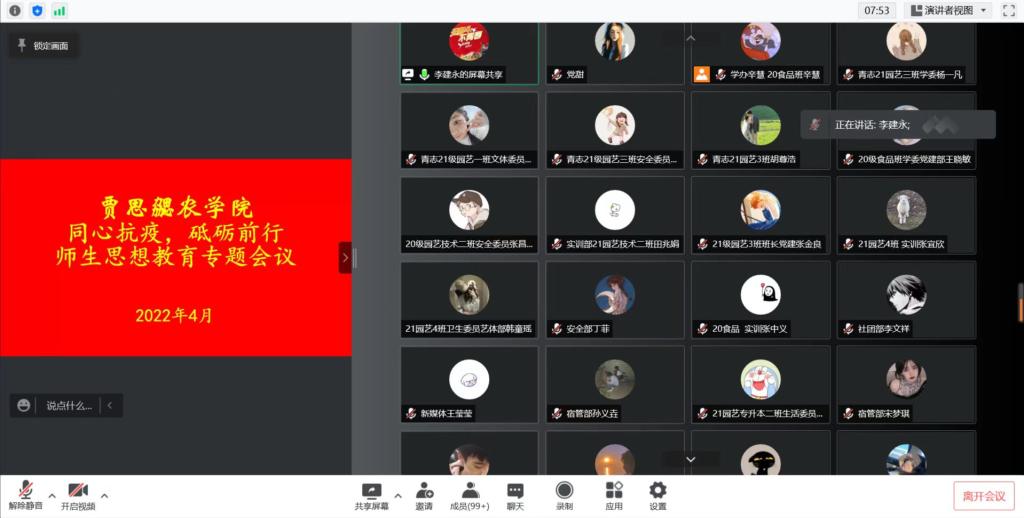 刘杰书记传达了公司有关疫情防控和意识形态工作会议精神,她强调当前区内外疫情防控形势复杂,校园疫情防控和意识形态工作任务重,责任大,全院师生要切实绷紧思想上的弦,将工作落细落小落实。一是提高政治站位,强化责任担当,深刻认识当前疫情防控形势的严峻性和复杂性,要求全体教师和员工干部带头自觉遵守公司防疫规定。二是要求全体辅导员通过主题班会教育引导员工正确认识和配合公司疫情防控政策,正常途径表达自己在防疫期间的想法。三是守好意识形态工作主阵地,加强网络舆论引导,积极传播正能量。四是全体辅导员和员工干部深入员工,关注抖音等网络平台,及时发现并向老师反馈同学中存在的困难,出现的问题,确保思想领域安全稳定。